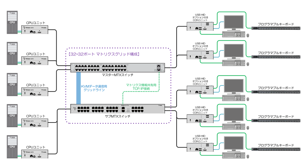 2021年の導入当初は、当時のシステム規模から32ポートのMTXスイッチ1式を使ってKVMシステムを構築していましたが、システム全体の拡張・更新に伴い、2025年に更に32ポートのMTXスイッチを追加増設し、2式のMTXスイッチをグリッド構成(タイライン接続)することでKVMシステム全体のサイズアップを図っています。これにより、今後の更なるシステム拡張においては、CPUユニットやCONユニットの増設だけで容易に対応できます。